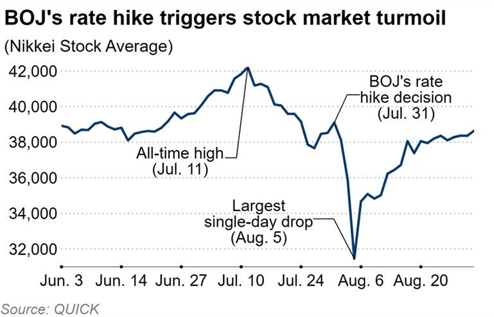 2024年8月5日,日本基准指数——日经225股指遭遇了1987年全球股市崩盘(即“黑色星期一”)以来的最大单日跌幅, 但随即又在次日创下了2008年以来的最大单日涨幅,并在9月份继续小幅上涨。贝莱德日本区主动投资主管Yue Bamba在接受《日经亚洲》采访时表示,此次波动似乎导致短期投资者及投机者纷纷退出,而那些具有长期眼光的投资者似乎有意坚守阵地。[1]