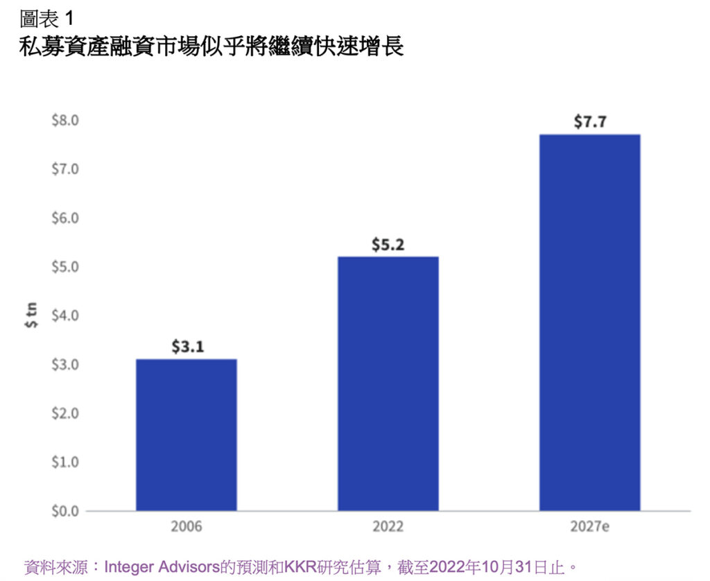 當中有一個類別似乎將會加速發展:該類別在 2008 年環球金融危機之後已取得穩步增長,這就是私募資產融資(ABF)。[4] 該類別的市場規模從 2006 年估值為 3.1 萬億美元,增長到 2022 年的 5.2 萬億美元。 根據全球頂尖的創新投資管理公司 KKR 的預測,由於傳統融資提供方因加息和銀行體系波動而退出市場,到 2027 年這一數字可能會進一步擴大至 7.7 萬億。[5]