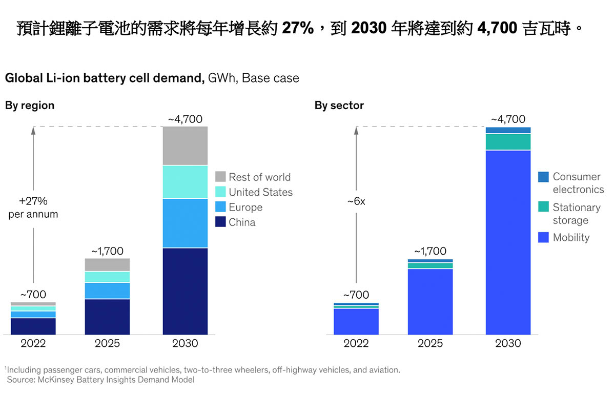 針對鋰(尤其是鋰離子電池)的樂觀情緒不僅限於採礦行業。 麥肯錫 (McKinsey) 預計,到 2030 年,需求將大幅穩步增長(見圖3)。