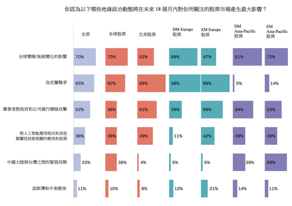 當被問及未來 18 個月對股市影響最大的因素時,70% 的受訪者特別提到了氣候變化——比例高於烏克蘭戰爭(65%)以及針對政府和企業的網絡攻擊(52%)。