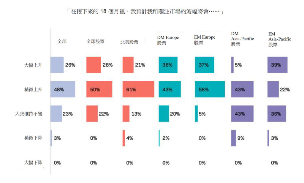 引用巴菲特(Warren Buffett)的說話:「在別人恐懼時保持貪婪」——當然,精明投資者可因市場波動而受惠。 參加調查的受訪者最普遍預計亞太區和歐洲新興市場的波幅將會加劇,這表明機會是留給有勇氣的人。