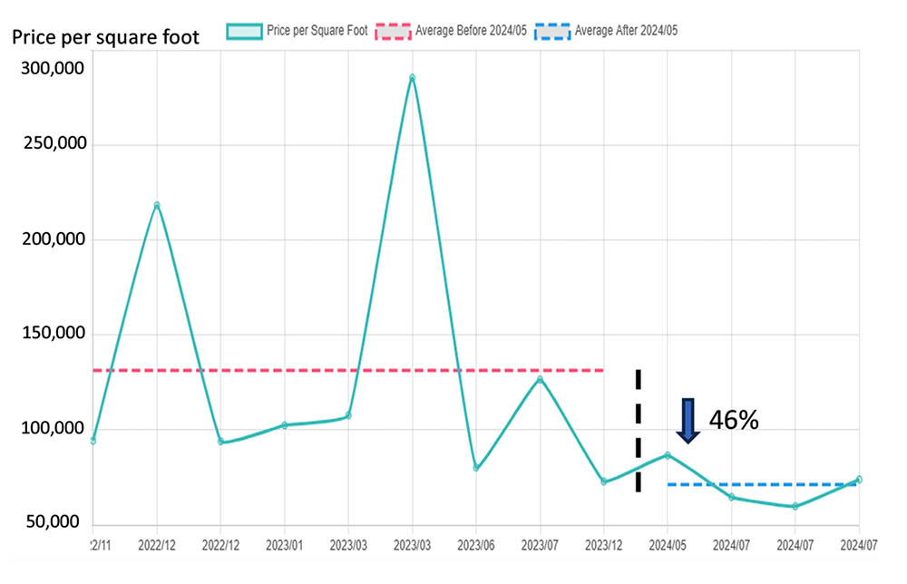 These are just two of several properties snapped up by opportunistic buyers in Hong Kong’s most exclusive neighborhood, The Peak, in the three months ending July 2024 at prices averaging 46% below their Covid-era valuations, according to international property agency Savills.[3] The agency attributed the sharp decline in prices largely to “several instances of distressed sales, where property owners were compelled to sell to settle outstanding debts.”