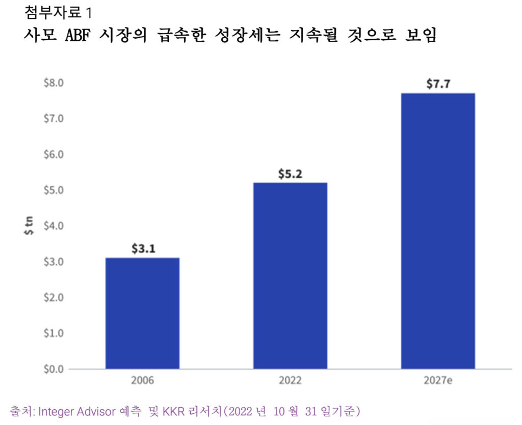 2008년 글로벌 금융위기 이후 꾸준히 성장해온 이후로 더욱 빠르게 성장할 것으로 보이는 범주 중 하나는 사모 자산기반 파이낸스(ABF)입니다.[4] 2006년 약 $3조 1,000억에 달했던 이 시장의 규모가 2022년에는 $5조 2,000억으로 성장했습니다. 그리고 세계적인 대체투자 운용사 KKR의 전망에 따르면, 금리 상승과 은행 시스템의 변동성으로 인해 기존 대출기관들이 몸을 사림에 따라 이 시장의 규모가 2027년에는 $7조 7,000억 규모로 더욱 확대될 가능성이 있습니다.[5]