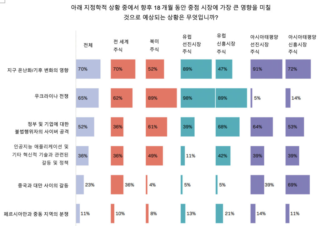 전 세계 주요 금융기관의 투자 의사결정권자들은 이러한 리스크를 심각하게 인식하고 있습니다. EquitiesFirst가 Institutional Investor와 함께 주식시장 전망에 대해 실시한 권위 있는 연구에서 설문조사 대상자 중 대부분은 기업과 정부에 대한 악성 사이버 공격을 현재 가장 중요한 지정학적 우려사항 중 하나로 지목하면서 사이버 보안 리스크를 기후 변화 및 우크라이나 전쟁 다음으로 꼽았습니다.