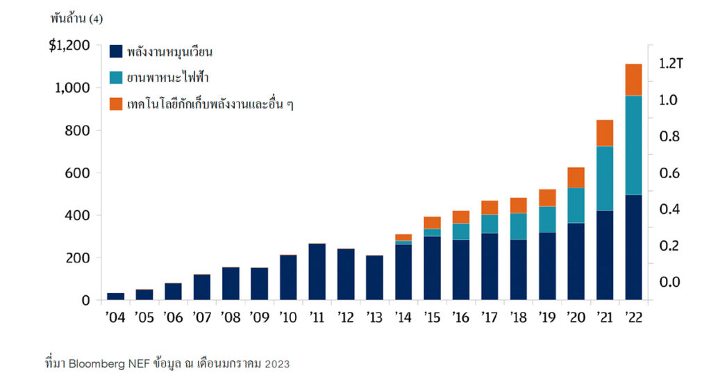ในบรรดาโอกาสเหล่านี้ สิ่งที่น่าสังเกตก็คือ การลงทุนในยานพาหนะไฟฟ้าเมื่อปีที่แล้วเกือบจะเทียบเท่ากับการลงทุนในพลังงานหมุนเวียนเลยทีเดียว ส่วนเทคโนโลยีการกักเก็บพลังงานก็ดูเหมือนจะมีอัตราส่วนการลงทุนเติบโตขึ้นอย่างมาก เพราะหนึ่งในอุปสรรคสำคัญของการนำพลังงานหมุนเวียนมาใช้อย่างแพร่หลายก็คือปัญหาการกักเก็บพลังงาน