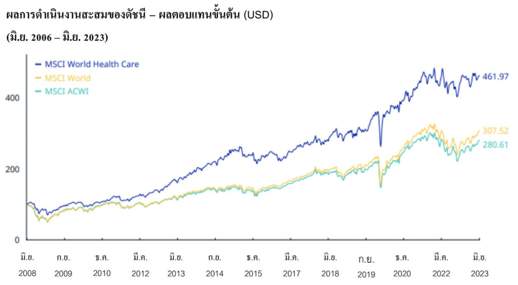 ณ วันที่ 30 มิถุนายนของปีนี้ ดัชนี MSCI World Health Care Index มีผลตอบแทนขั้นต้นเป็นสกุลเงินดอลลาร์สหรัฐสูงกว่าดัชนี MSCI World Index ถึง 50% ตั้งแต่เดือนมิถุนายน 2008[2]