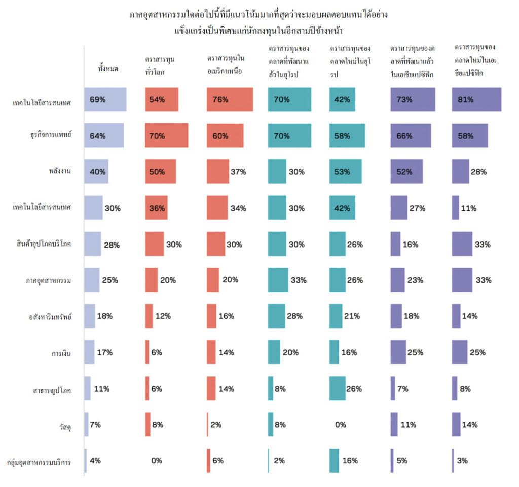 รายงานแสดงว่า ภาคอุตสาหกรรมเดียวที่นักลงทุนมองว่ามีอนาคตสดใสกว่าธุรกิจการแพทย์คือภาคอุตสาหกรรมเทคโนโลยี ในขณะเดียวกันก็มีภาคอุตสาหกรรมที่ได้รับความสนใจน้อยมากเนื่องจากอ่อนไหวต่ออัตราดอกเบี้ยสูงและภาวะการเติบโตของเศรษฐกิจชะลอตัว ได้แก่ อสังหาริมทรัพย์และการเงิน