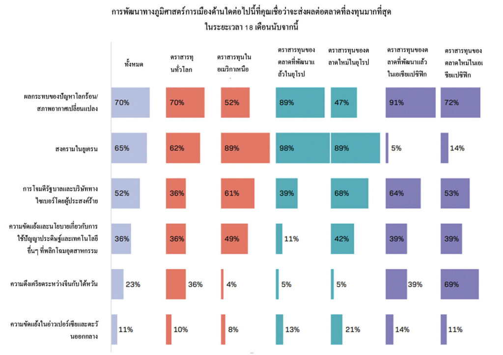 จากการสำรวจความคิดเห็นของผู้อำนาจตัดสินใจด้านการลงทุนในบริษัทบริหารจัดการสินทรัพย์ มูลนิธิ กองทุนบำเหน็จบำนาญ และกองทุนเพื่อการกุศลทั่วโลกประมาณ 300 รายในการศึกษาครั้งล่าสุด ผลปรากฏว่า นักลงทุนเชื่อว่าการเปลี่ยนแปลงของสภาพอากาศจะเป็นหนึ่งในปัจจัยด้านภูมิศาสตร์การเมืองที่สำคัญที่สุดที่จะส่งผลต่อราคาตราสารทุนในอีก 18 เดือนข้างหน้า